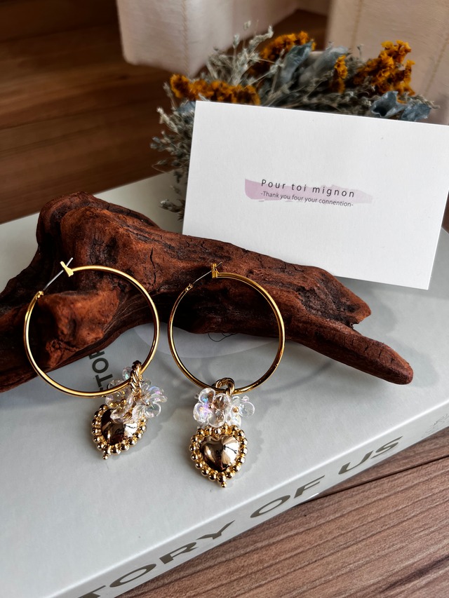 大きめのフープピアスに 小さな花パーツにハートパーツを デザインしました。 オールシーズン使いやすいデザインに なっています♡ チタン素材のピアスを使用しています。 アレルギー反応を起こしにくい素材です。 縦約6cm 横約4cm ※こちらはアレルギー対応しておりません。 お肌が弱い方はご購入お控え下さいませ。 ※パーツ接着する際強度面から少しはみ出してつけています。予めご了承下さいませ。 ※海外製パーツ使用しております。 色ムラ.ゆがみ.小さな傷.バリなどがある場合がございます。 予めご了承下さい。 ※こちらはハンドメイド作品です。 ひとつひとつ丁寧に作ることを心がけていますが既製品に比べて強度面が落ちます。 ご理解頂いてからご注文下さいませ。
